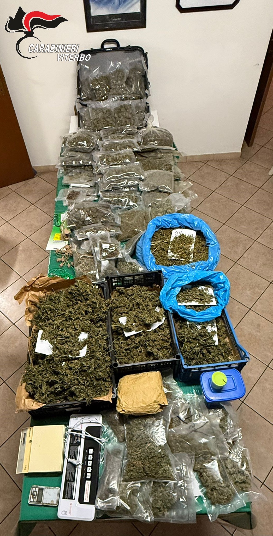 I militari della stazione di Soriano nel Cimino, perlustrando la S.P. Ortana, hanno fermato l’uomo trovando residui di droga nell’abitacolo. Sospettando che l’uomo potesse aver trasportato significative quantità di stupefacenti con lo stesso mezzo, hanno deciso di perquisire abitazione nella sua disponibilità ad Attigliano (Tr), dove sono stati rinvenuti circa 2,56 chili di marijuana, suddivisi in numerose buste e cassette di plastica, 2 bilancini di precisione e macchina plastificatrice.