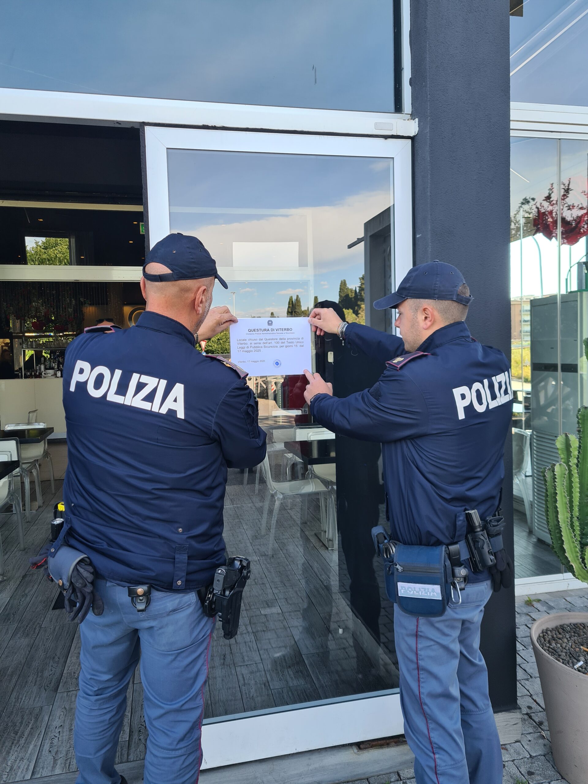 Gli agenti della questura di Viterbo hanno notificato al titolare di un noto bar del capoluogo un provvedimento di chiusura ai sensi dell’articolo 100 del Testo Unico delle Leggi di Pubblica Sicurezza per un periodo di quindici giorni.