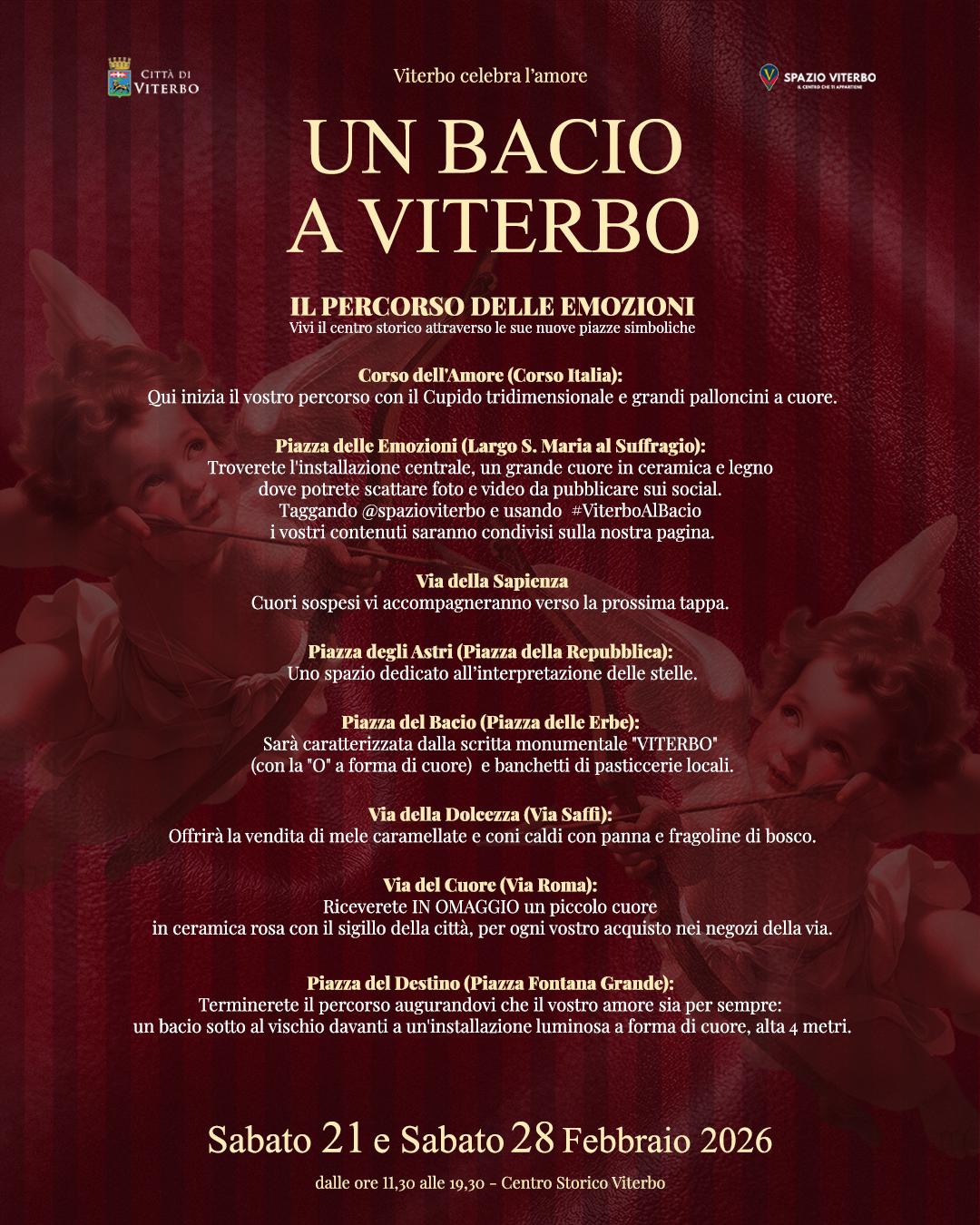 “Un Bacio a Viterbo” è il progetto-evento che, nelle giornate di sabato 21 e sabato 28 febbraio 2026, trasforma il centro storico in un percorso simbolico dedicato all’incontro, alla condivisione e alle relazioni.