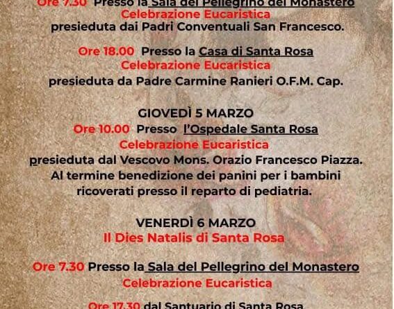 Per tale giornata, a partire dalle ore 15,30 fino al termine dell’evento religioso, sarà istituito il divieto di sosta con rimozione forzata su entrambi i lati di via Santa Rosa, dal sagrato del santuario a piazza Verdi, via Matteotti e piazza San Francesco.
